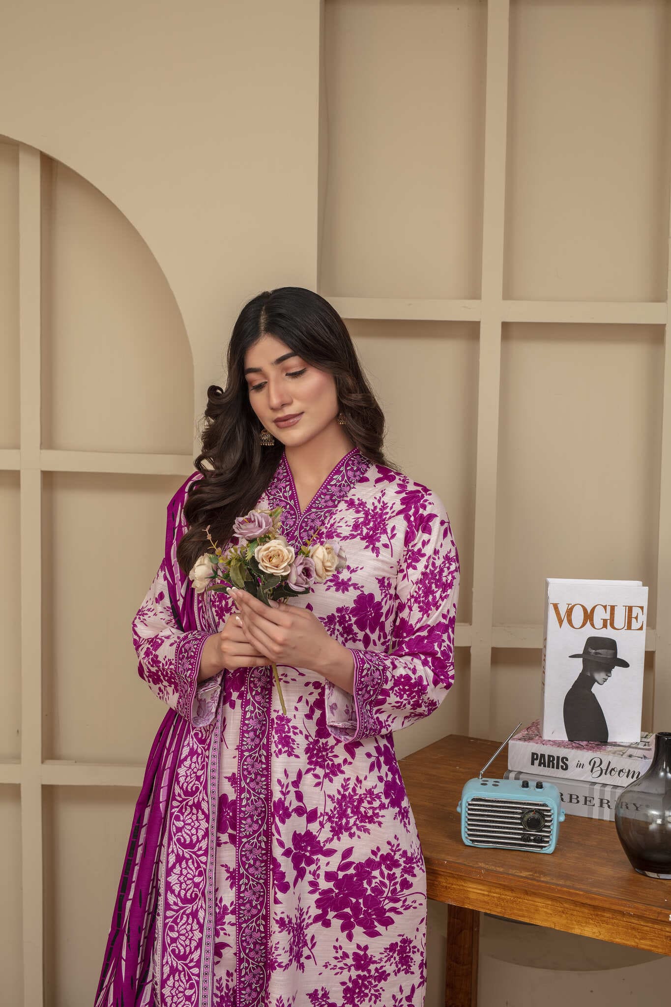Product Detail A blush pink printed khaddar shirt with floral and striped accents, paired with a matching printed dupatta and a dyed trouser.
